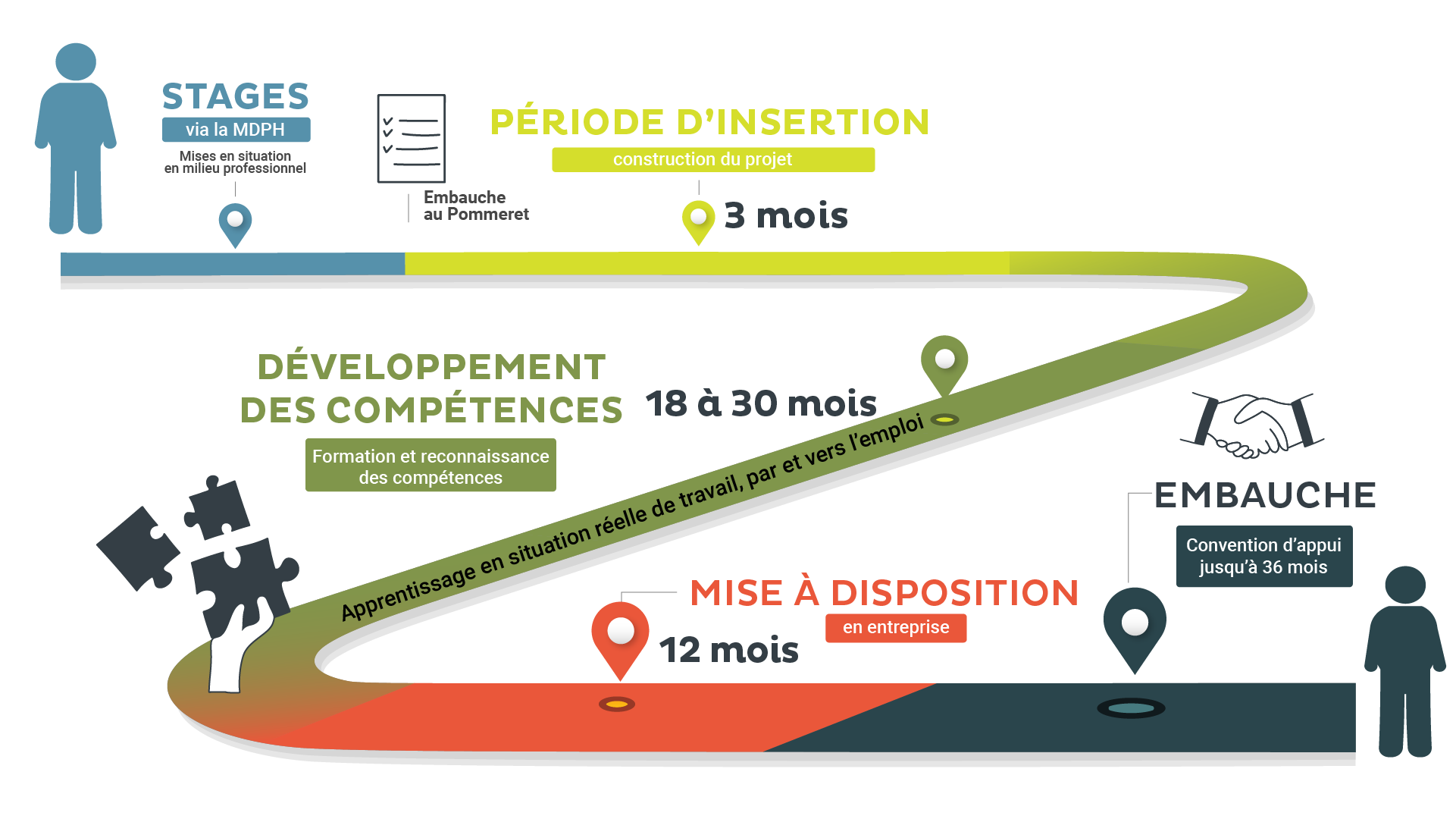 Afin de garantir le bon déroulement de l’accompagnement en ESAT de transition, l’APH le Pommeret a mis en place un parcours bien spécifique.